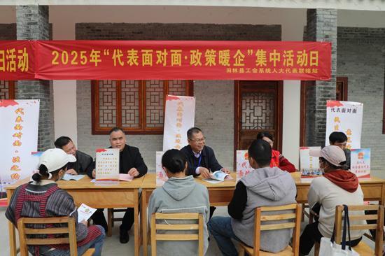 “代表面对面·冬日暖阳”服务企业座谈会现场。田林县人大供图12月9日,田林县人大常委会联合县总工会、县委社会工作部、团县委及县直多部门,在田林县林业产业园区集中开展“代表面对面·冬日暖阳”服务企业活动。活动以“服务企业 冬日护权益 文体聚活力”为主题,创新采用“座谈问需+政策速递+精准对接”多元服务模式,将政策支持、金融助力、权益保障等服务精准送达企业一线,切实为冬日里的县域实体经济送上“暖心服务包”,为企业发展注入温暖动能。